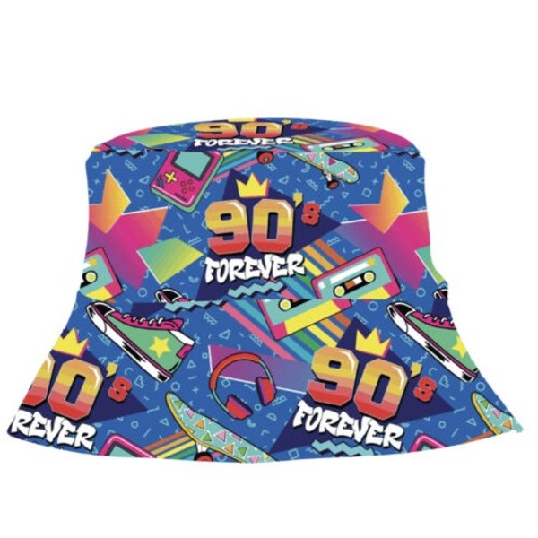 Retro slušivý klobouk 90. léta modré barvy s barevným potiskem je velmi vhodný na disco nebo retro párty,