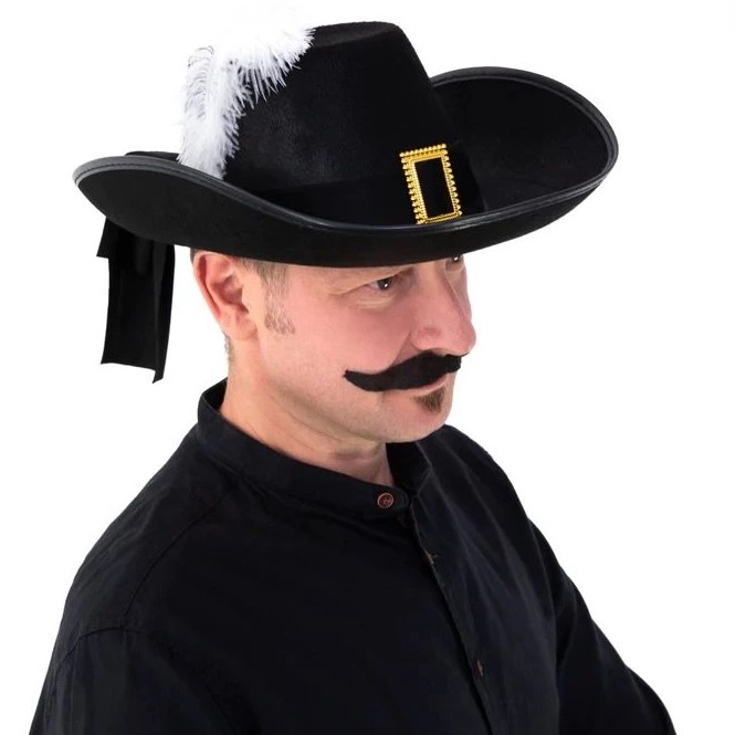 Černý klobouk, který je svým designem nepostradatelný doplnk kostýmu mušketýra.