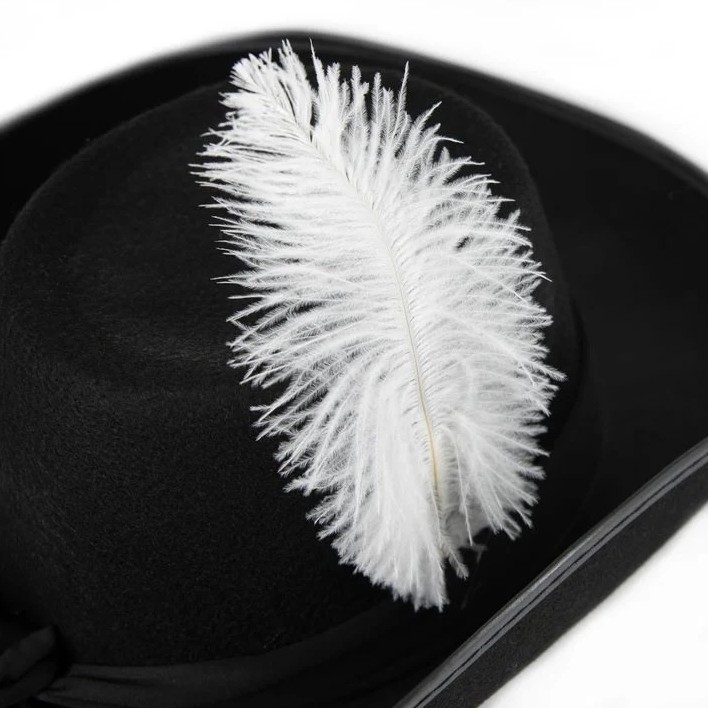 Tento klobouk má propracované detaily v podobě zlaté přezky, černé stuhy a bílého pírka.