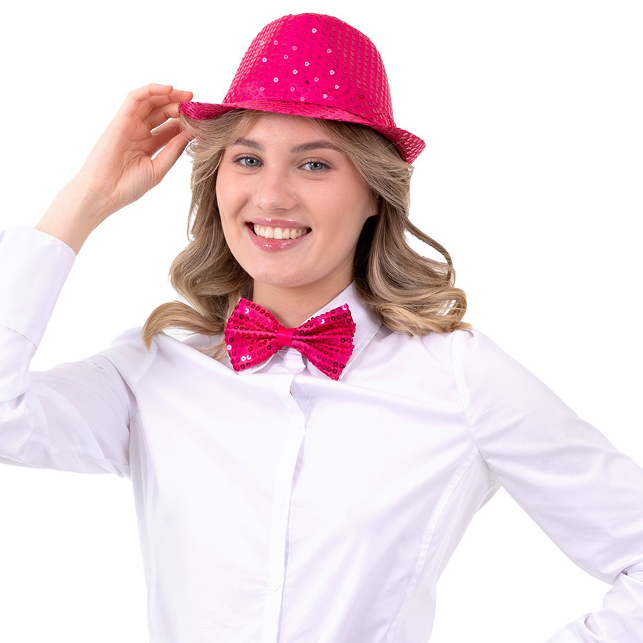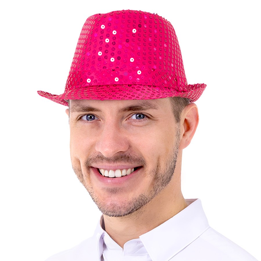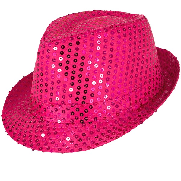 Růžový klobouk s flitry je elegantní a slušivý a je určený pro dospělé. Je nápadný díky flitrům, které jsou rozseté po celé ploše klobouku.