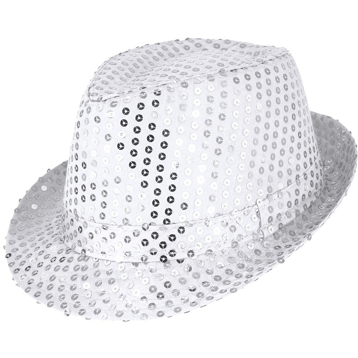 Stříbrný klobouk s flitry je elegantní a slušivý a je určený pro dospělé. Je nápadný díky flitrům, které jsou rozseté po celé ploše klobouku.