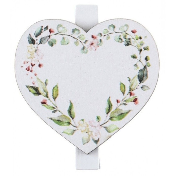 Jmenovky s vícebarevnými ilustracemi rostlin a lístečků jsou připevněné na dřevěném kolíčku.