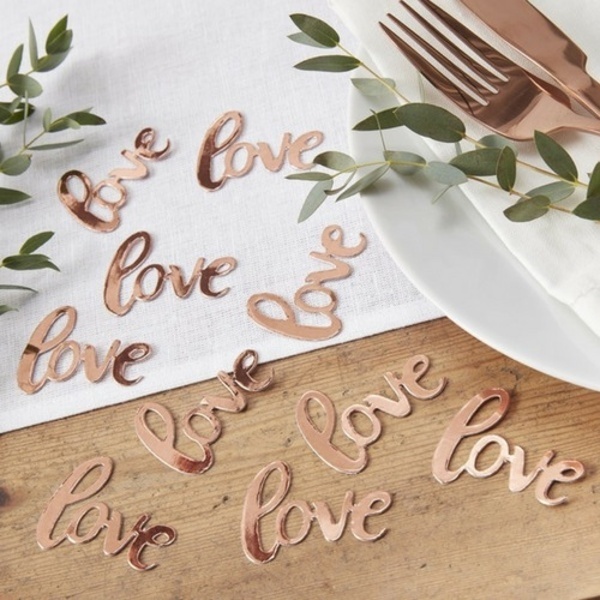 Vyznejte svou lásku lesklými konfetami v barvě růžového zlata. Tyto konfety jsou ideální na narozeninovou oslavu v barvě rose gold, svatby, výročí, valentýnskou večeři nebo zasnoubení.