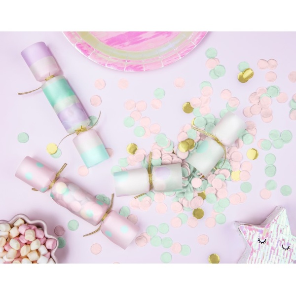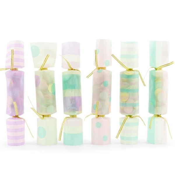 Sada 6 konfetových tub v podobě bonbónu v krásných kombinovaných pastelových odstínech, zakončených zlatými stužkami.