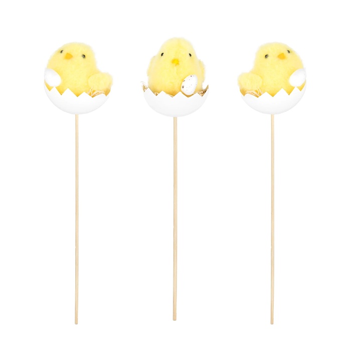 Velikonoční dekorace kuřátko ve skořápce na špejli okamžitě navodí jarní a velikonoční atmosféru na vašem stole, okenním parapetu či v květináči. Roztomilé žluté kuřátko vykukující z rozbité skořápky je ideální jako drobná dekorace na velikonoční párty. Stačí jej zapíchnout do aranžovací hmoty, kytice, květináče nebo do aranžmá z měchu a během chvilky vytvoříte milé jarní zákoutí bez složitosti.