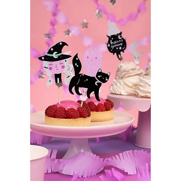 Tyto originální zápichy zobrazují charakteristické prvky spojené s Halloweenem, jako je čarodějnice, kotel s lektvarem, duch, černá kočka a měsíc, vše v zajímavých barvách.