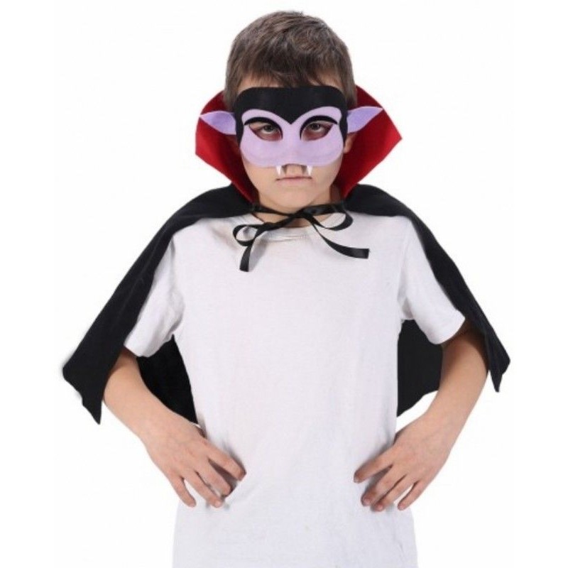 Set obsahuje polomasku na obličej v černo-fialové barvě s bílými upířími zuby a krátký černý plášť se zabazováním pod krkem. Plášť je zdobený červeným vysokým límcem.