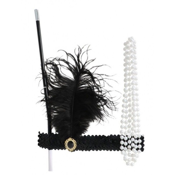 | Sada kostýmových doplňků Charleston Set obsahuje držák na cigaretu, čelenku s kamínky a černým peřím a maketu dlouhého … |