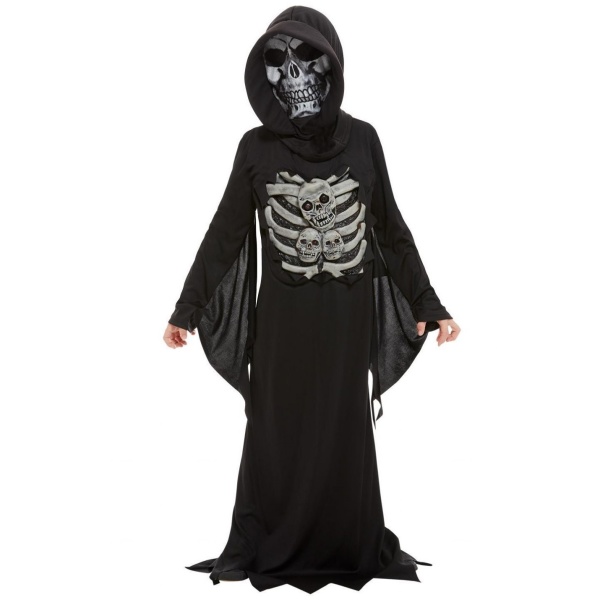 Děsivý dětský kostým je s kapucou, má potrhané cáry na rukávech a potisk kostí a lebek na hrudníku.