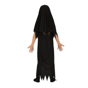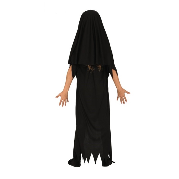 Dětský strašidelný kostým malé jeptišky se skládá z černých dlouhých šatů s bílými prvky.
