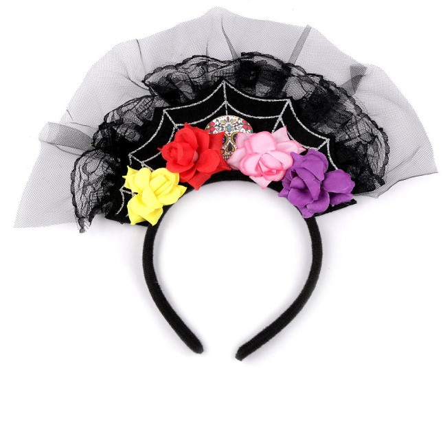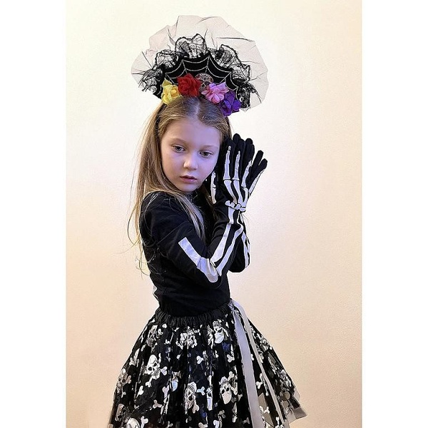 Dětský kostým kostra se skládá z tylové sukýnky, působivé čelenky (s tylem, krajkou a květy) a z rukavic.