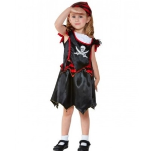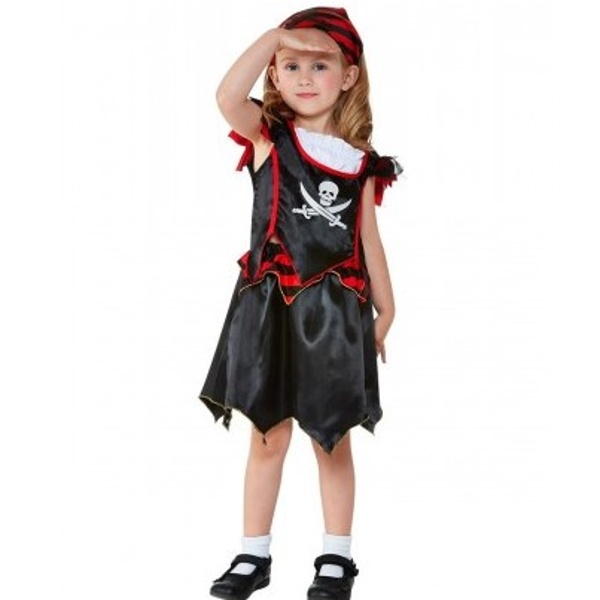 Kostým obsahuje černo-červený top s obrázkem bílé lebky, černou střapatou sukýnku a šátek na hlavu.