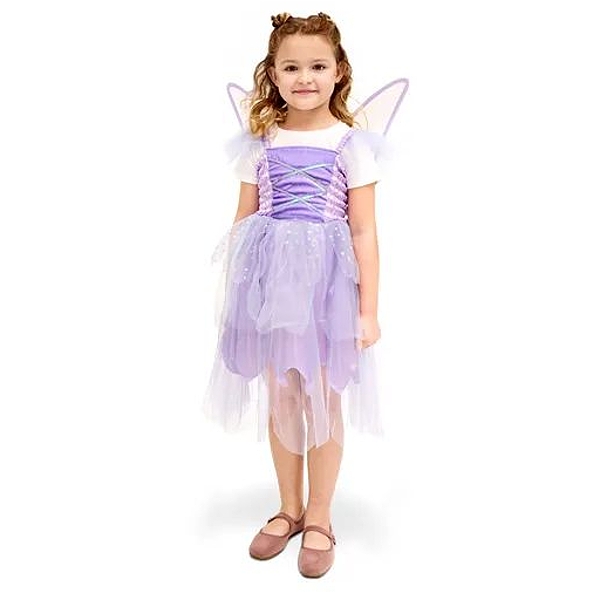 Sada obsahuje fialové šaty s modrými tylovými akcenty a síťovanými křídly, připevněnými na zadní straně šatů pomocí suchých zipů.