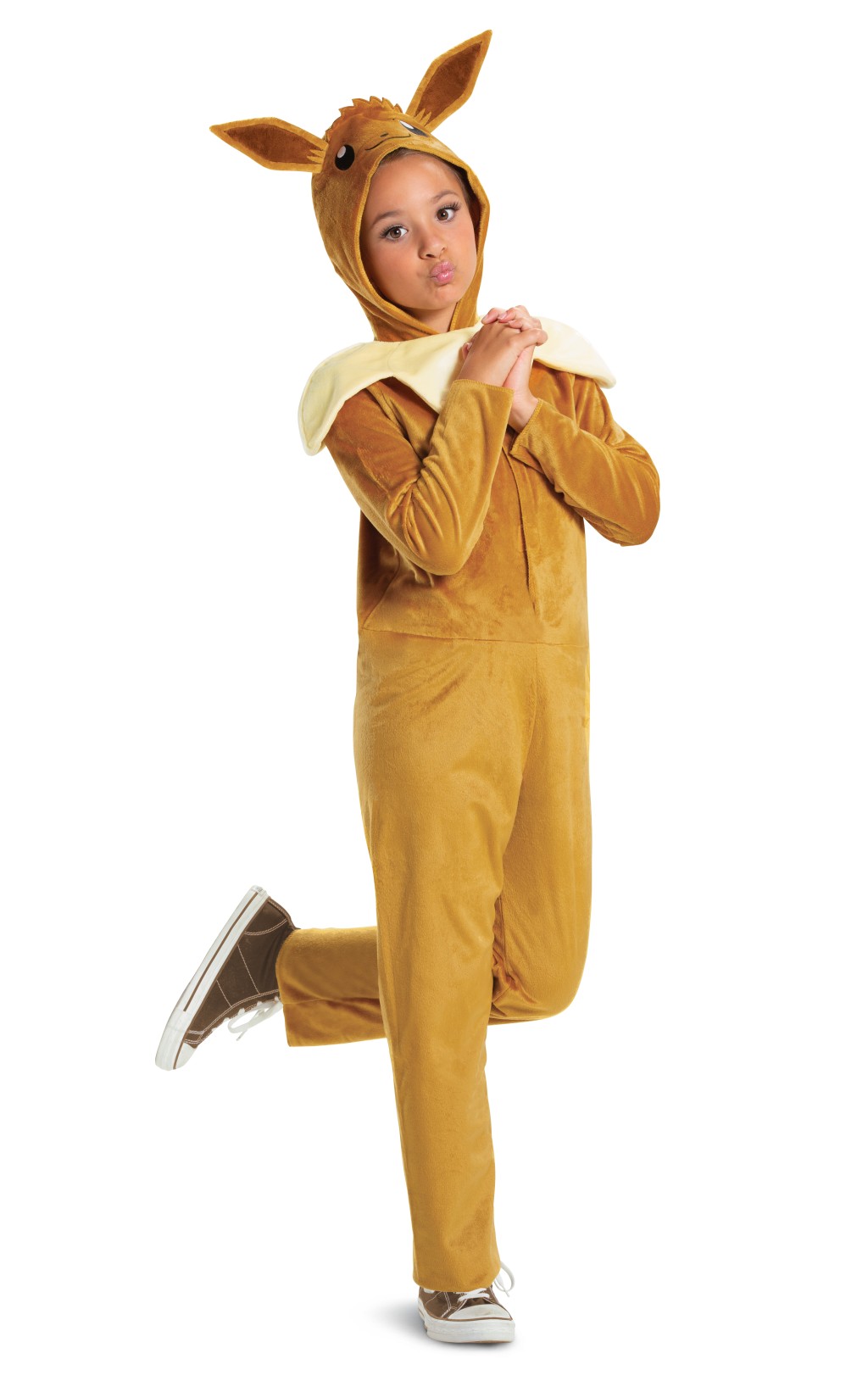 Dětský kostým Pokémona Eevee zahrnuje kombinézu s pokrývkou hlavy s připojenýma ušima a velkým límcem.