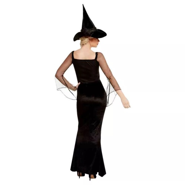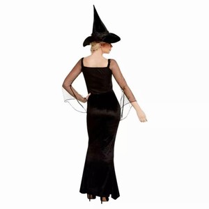 Jednoduché, ale krásné šaty pro čarodějnici jsou vyrobené z materiálu, imitujícího velur.