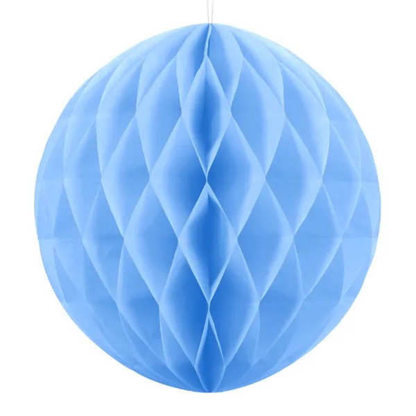 Světle modrá koule je vyrobená z hedvábného papíru o průměru 40 centimetrů. Opakovaně použitelná. Připevňuje se kancelářskou sponkou