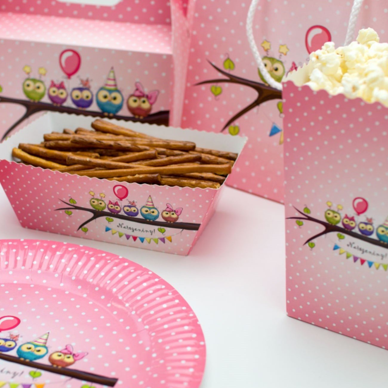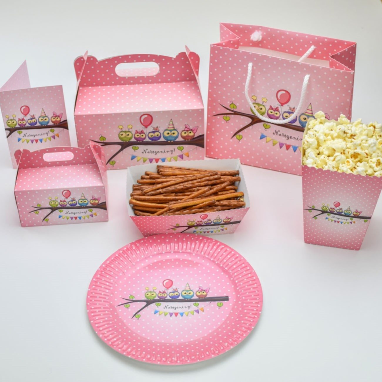 Papírová krabička s motivem růžových soviček je vhodná na popcorn, křupky, sušenky, zeleninové chipsy apod.. Narozeninový motiv je natištěn digitálním tiskem, papír ze kterého je krabička vyrobena, má atest pro přímý styk s potravinami.
