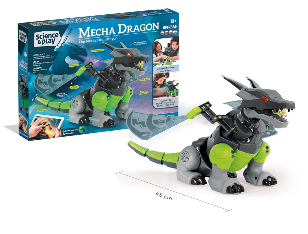 Interaktivní drak značky Clementoni. Sestavte si mechanického draka. Mecha Dragon s dětmi a okolím interaguje díky 3 motorům a senzorům. Drak je ovládán pomocí aplikace, která komunikuje s vysokofrekvenčními signály, nebo pomocí 4 infračervených senzorů. Díky motorům dokáže pohybovat tlamou, křídli i celým drakem. Celkově drak disponuje 22 funkcemi. Vhodný pro děti od 8 let.