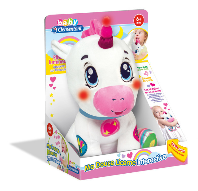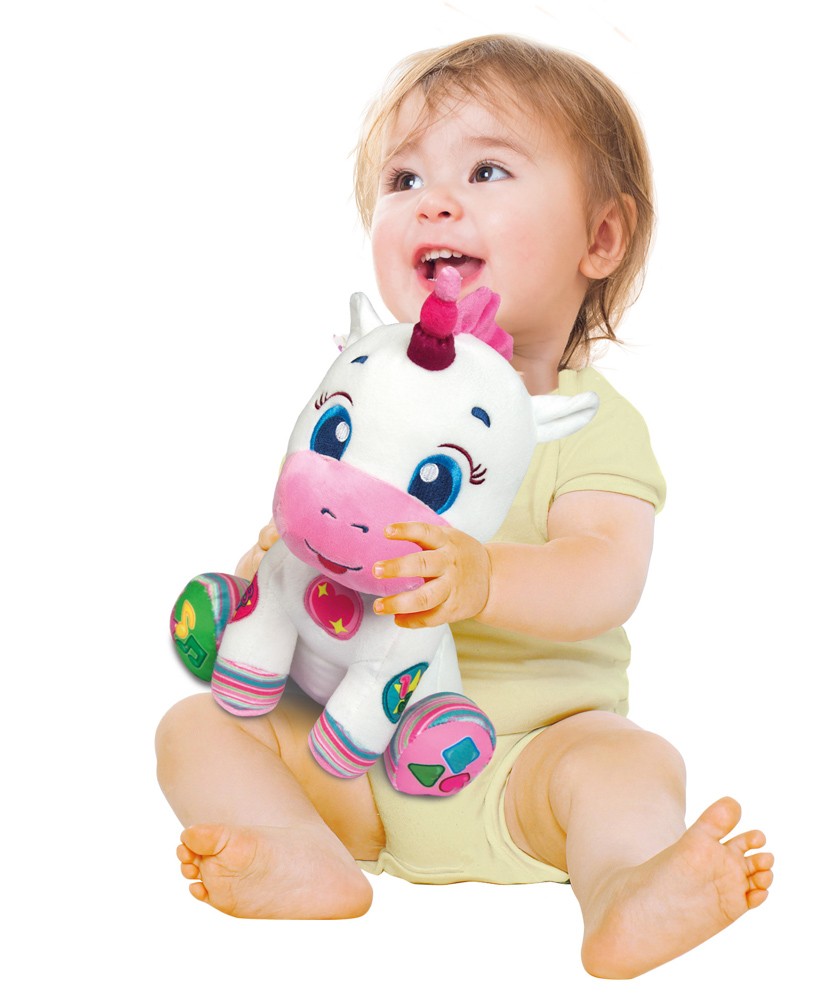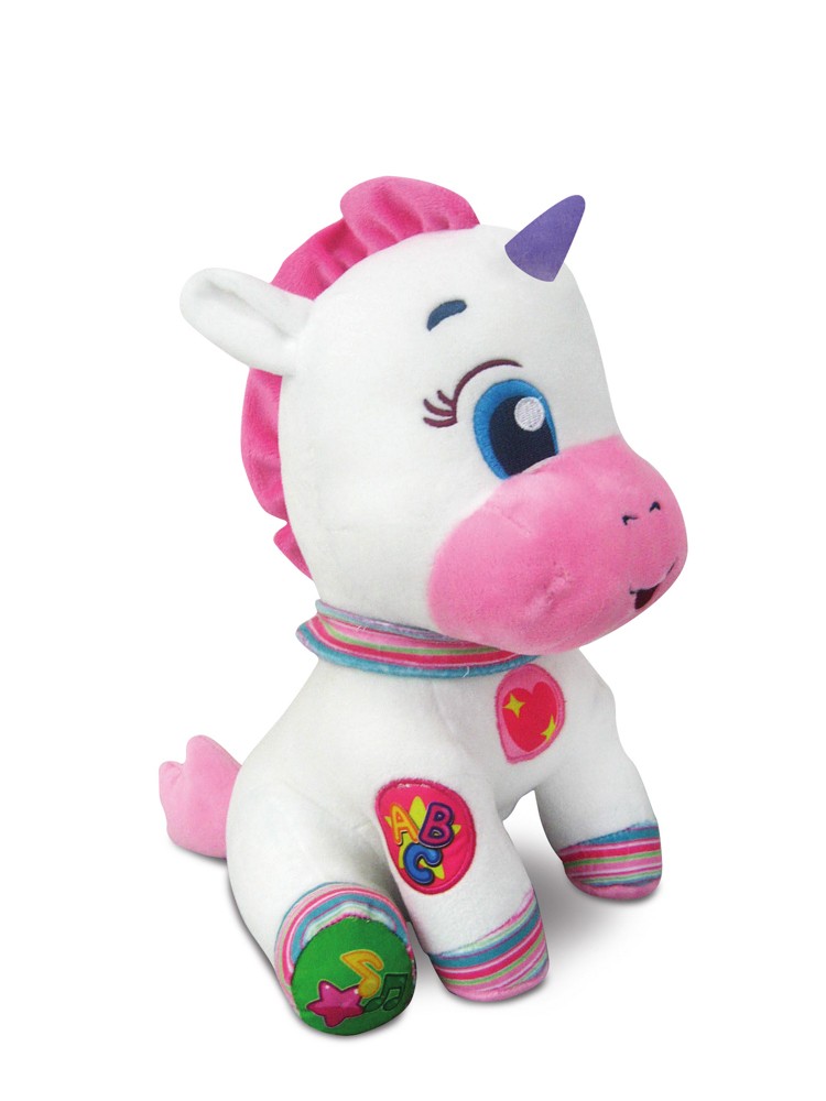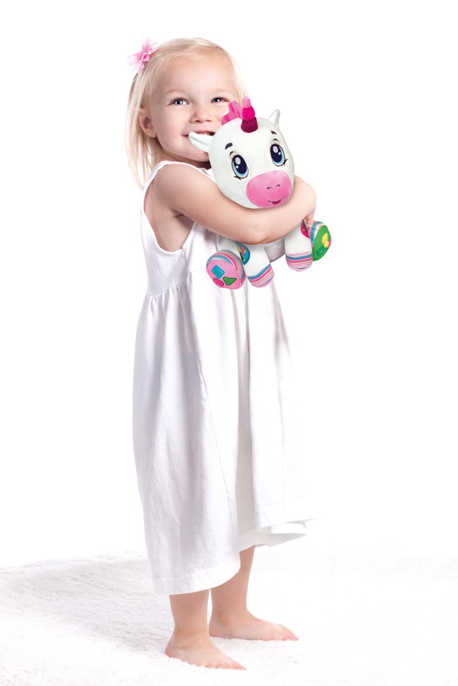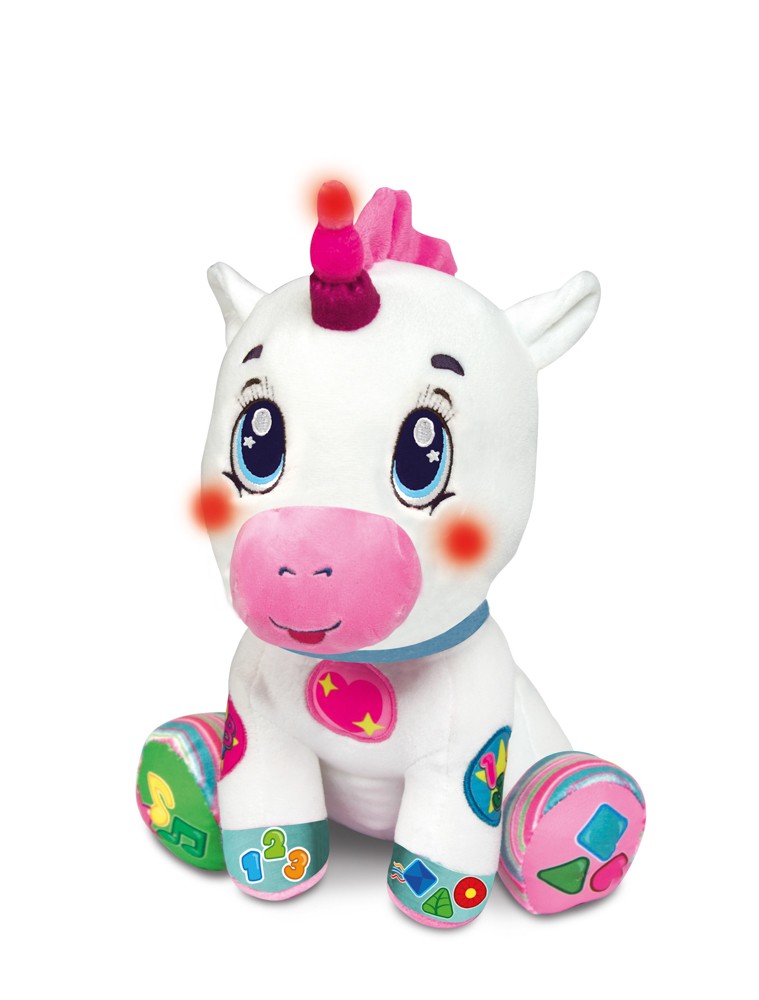 - Plyšový interaktivní jednorožec s 5 interaktivními tlačítky pro výuku prvních čísel, písmenek, tvarů a barev. Děti se díky písničkám a veselým rýmovačkám naučí nová slovíčka. Pomáhá s psychomotorickým, emočním a smyslovým rozvojem dítěte.