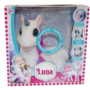Pohádkový plyšový jednorožec Luna ti poví 3 pohádky (Popelka, Zlatovláska a tři medvědi, Na vlásku). Luna mrká očima a její roh svítí magickými barvami. Navíc je to opravdu krásná hračka