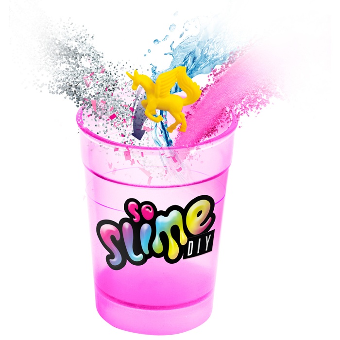 Vyrobte si svůj vlastní sliz. Nasypejte do kelímku prášek, přidejte glitry a figurku.