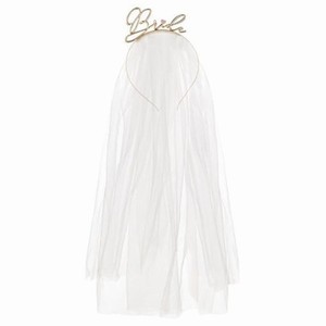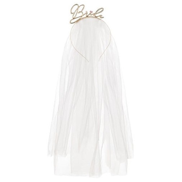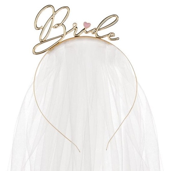 Pak je tu pro vás tato kouzelná zlatá čelenka s nápisem Bride a krásným bílým závojem.