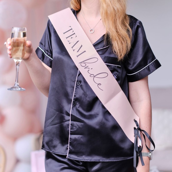 Papírová šerpa v růžové barvě s černou stuhou a nápisem Team bride je nezbytný doplněk na rozlučku se svobodou pro označení kamarádek budoucí nevěsty.