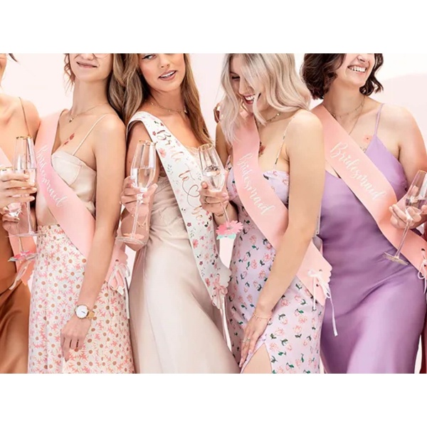 Balení obsahuje celkem 6 ks. Z toho 1 x šerpa pro budoucí nevěstu s květinovým potiskem a nápisem Bride to be v barvě růžového zlata a 5 x šerpy v růžové barvě pro kamarádky (družičky) s bílým potiskem.