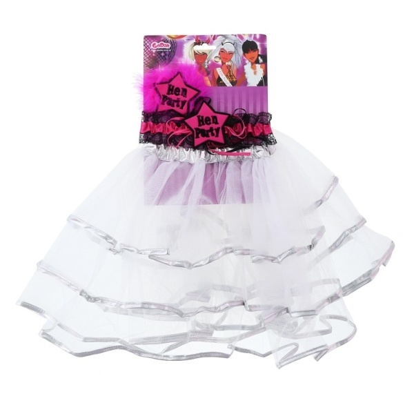 Set obsahuje bílou třívrstvou tutu sukýnku, zdobenou stříbrnými proužky, podvazek s černou krajkou a růžovými stuhami, který ozdobí uprostřed hvězda s nápisem Hen party a brož s růžovým chmýřím a stejným nápisem jako u podvazku. Brož má uzavírání na spínací špendlík.