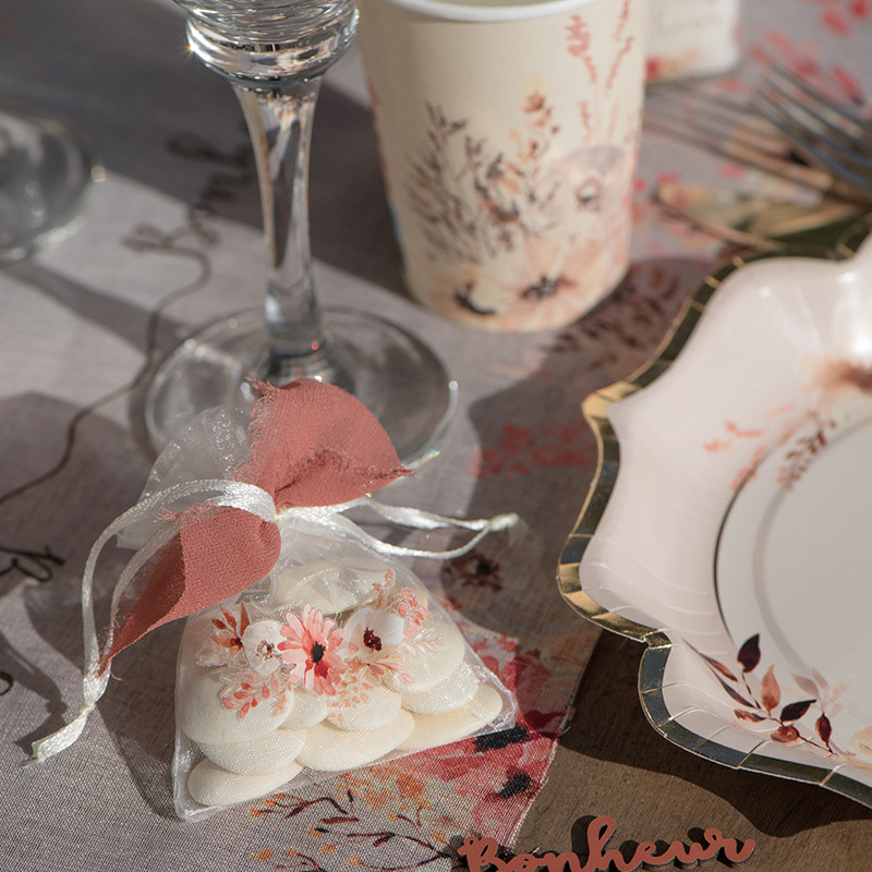 Organzové pytlíčky s květinovým vzorem, nakresleným akvarelem.