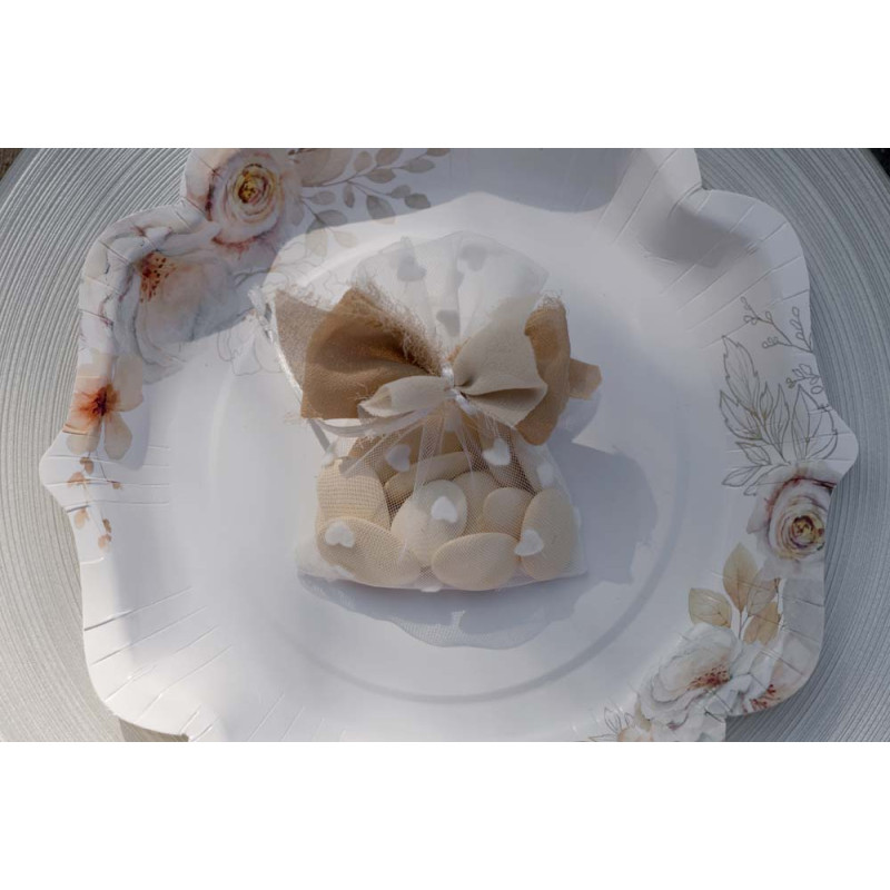 Stahovací pytlíčky z bílé organzy, zdobené bílými srdíčky jsou ideální pro svatební hosty na svatební mandličky, čokoládky apod.