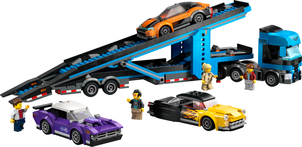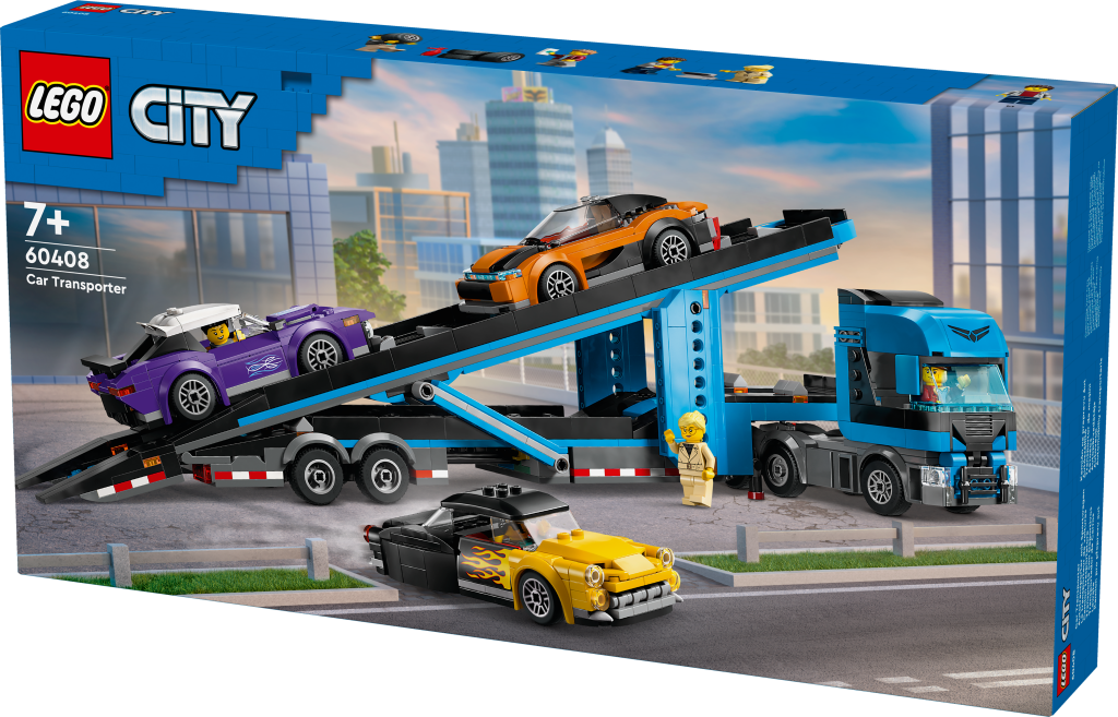 - „Potěšte milovníky aut od 7 let stavebnicí LEGO® City (60408) Kamion pro přepravu aut se sporťáky. Děti mohou naklonit kabinu řidiče, aby se dostaly k motoru, připojit přívěs a spustit rampy na horní a dolní plošině, aby na přívěs mohly vyjet s vozidlem ve stylu 50. let, výkonným sporťákem ve stylu 70. let a moderním elektrickým superautem. Součástí této působivé stavebnice s kamionem jsou také 4 minifigurky pro kreativní hraní a vyprávění příběhů. Součástí této hračky LEGO s kamionem je podrobný tištěný návod na stavění a 3D návod v aplikaci LEGO Builder, což je digitální průvodce stavěním s intuitivními nástroji přibližování a otáčení. Umožní jim prohlížet si modely ze všech úhlů, zatímco na nich pracují. Stavebnice LEGO City představují skvělé vánoční nebo narozeninové dárky pro děti a součástí jsou parádní vozidla, realistické modely a zábavné postavy, které inspirují nápadité hraní bez hranic. Děti mohou tuto stavebnici kombinovat s dalšími sadami z řady LEGO City (prodávají se samostatně) a rozšířit si tak svět herních možností.“