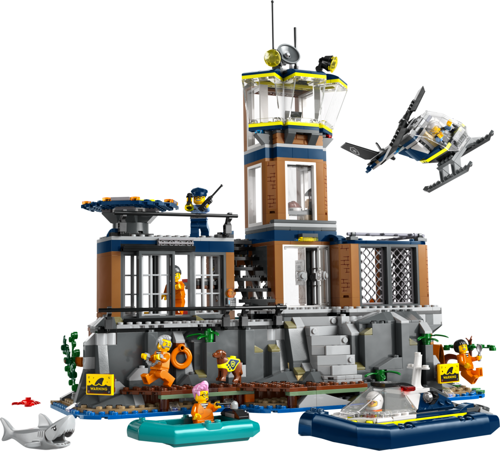 - LEGO® s vězením na ostrově je plné zábavných funkcí – Součástí je cela s únikovým tunelem, který vede do opuštěného dolu, a vězeňský dvůr s tajným únikovým poklopem, který vede do nepoužívaného kanalizačního potrubí