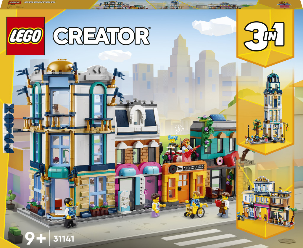 - 3 stavitelské zážitky v 1 sadě – Stavebnice LEGO® Creator 3 v 1 (31141) Hlavní ulice dětem nabízí přehrávání zábavných příběhů ve městě se 3 různými modely: ulicí města, secesním domem a ulicí s trhem