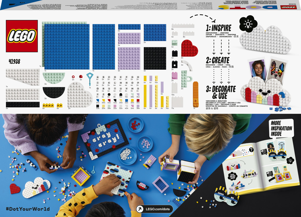 Ve stavebnici nechybí brožurka plná kreativní inspirace, spoustu návodů na stavění doplňků do pokoje ale naleznete také online na stránce LEGO.com/buildinginstructions. V brožurce je navíc návod k sestavení 5 přizpůsobitelných DOTS modelů – organizéru na stůl, dvoupatrového šuplíku, závěsné tabule, rámečku na fotky a malé přihrádky. Děti také mohou psát vzkazy a zdobit své výtvory s pomocí barevných zdobítek a dílků s písmenky nebo dají své kreativitě ještě více prostoru s pomocí sad DOTS doplňky – 5. série (41932) a Záplava DOTS dílků (41935) (prodáváno samostatně).