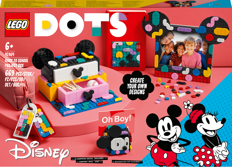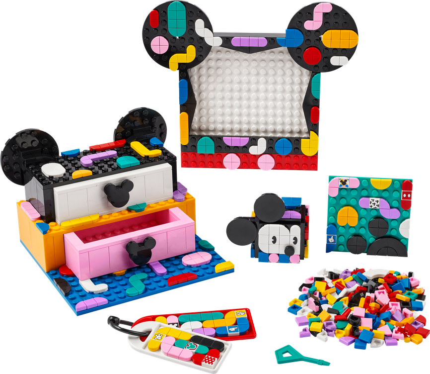 - LEGO® DOTS Školní boxík Myšák Mickey a Myška Minnie obsahuje 2 zásuvky s Mickeyho ušima, rámeček na obrázek, misky na poznámky s tajnou přihrádkou, 2 plochých ozdob na tašku a nalepovací záplaty. Probuďte v sobě kreativitu a ozdobte si jednotlivá příslušenství.