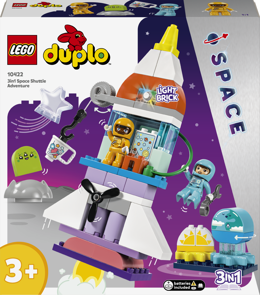 - Krabice plná zábavy – Součástí stavebnice je řada barevných kostek a doplňků ke hraní a figurka LEGO® DUPLO® mimozemšťana a 2 astronautů a děti se s ní vydají na nekonečná vesmírná dobrodružství