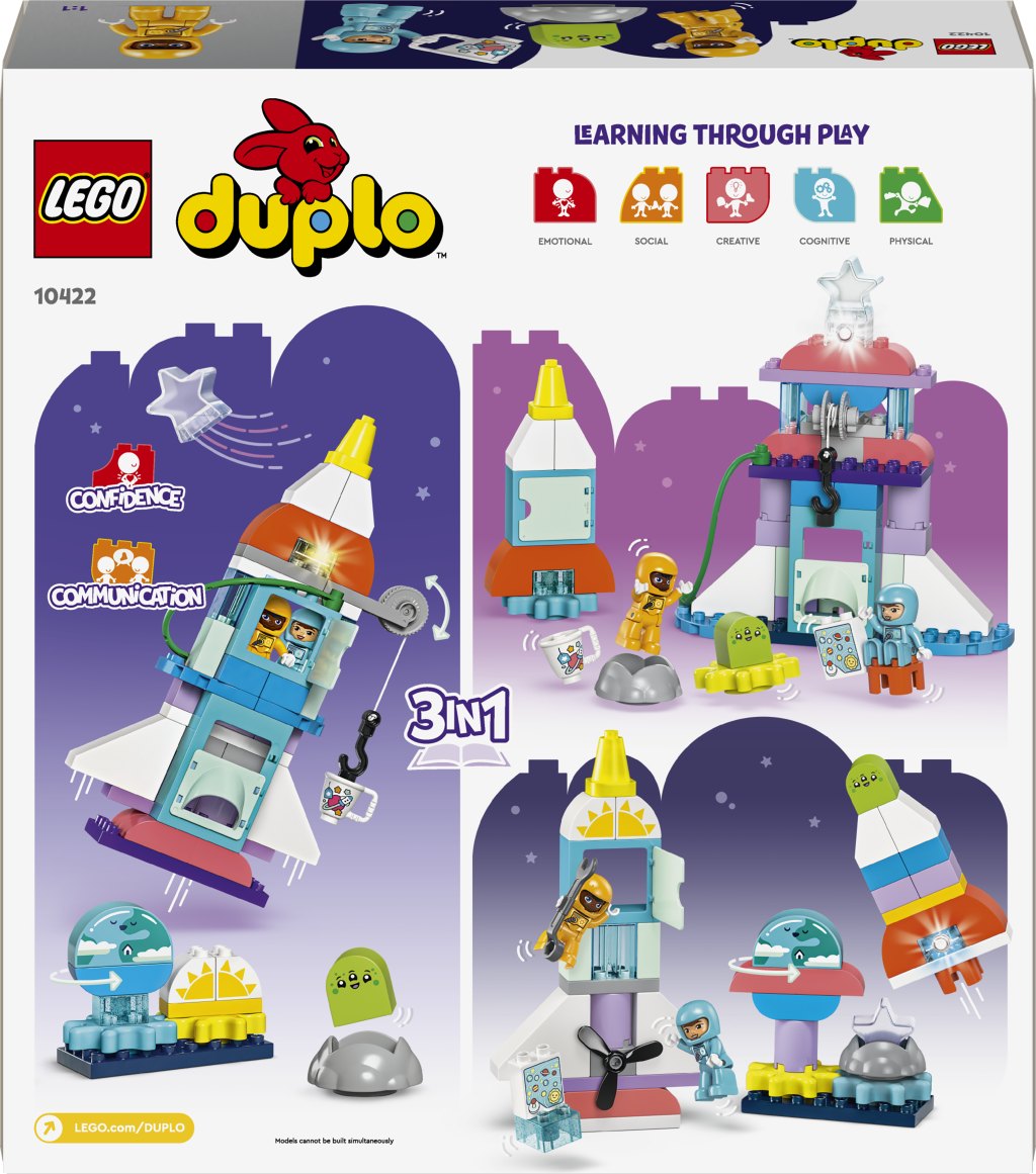 - Přestavitelný model raketoplánu – Potěšte malé astronauty od 3 let stavebnicí LEGO® DUPLO® Vesmírné dobrodružství s raketoplánem 3 v 1