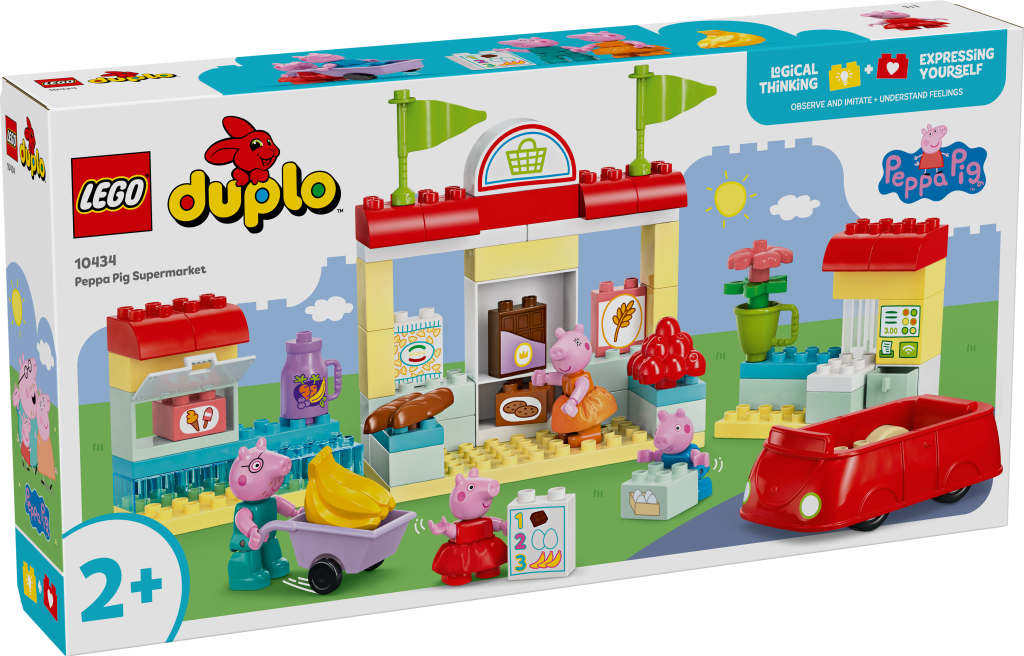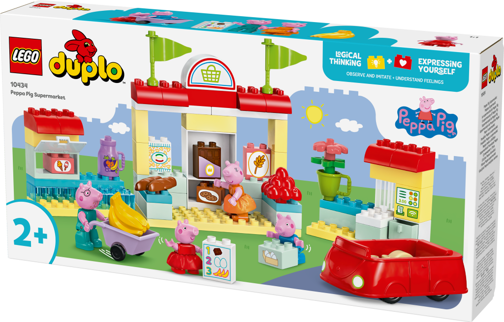 - „Pomozte dětem od 2 let zahrát si na výlet do obchodu s potravinami se stavebnicí LEGO® DUPLO® (10434) Prasátko Peppa a supermarket. Děti se stanou součástí rodiny a vydají se na nákup potravin v ikonickém červeném autě ze seriálu. Tato hračka pro děti na stavění a přestavování obsahuje spoustu doplňků, které podněcují tvořivé hraní rolí. Součástí jsou 4 figurky – prasátko Peppa, Tom, maminka a tatínek – a malí stavitelé si můžou hrát na děti i na rodiče. Děti objeví předměty ze skutečného obchodu s potravinami, jako je samoobslužná pokladna, nákupní vozík nebo mrazák. S touto vzdělávací hračkou LEGO DUPLO Prasátko Peppa inspirovanou televizním seriálem pro menší děti si malí stavitelé zahrají na nákup a prohloubí své dovednosti. Celá rodina může během hraní zkoumat i své pocity. Tato scénka podnítí konverzaci o chování v obchodě a – to je nejdůležitější! – o tom, kdo bude tlačit vozík.“