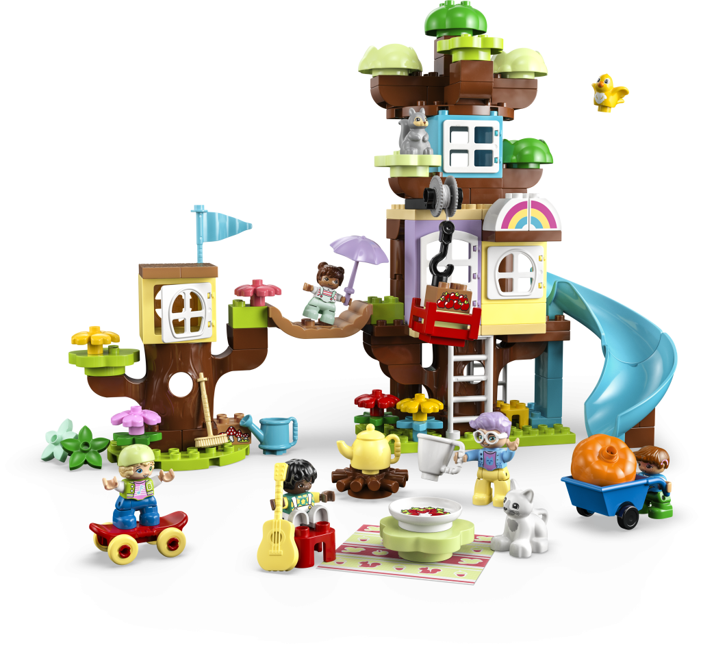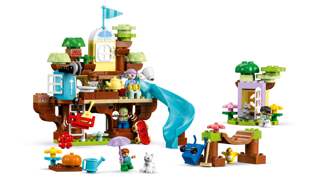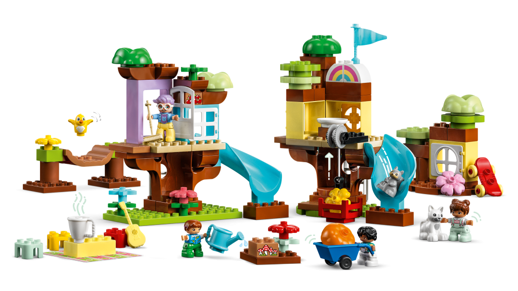 - Vyplňte hraní zábavným objevováním a představte nejmenším dětem tuto propracovanou stavebnici domu na stromě. Děti překonají vratký lanový most a sklouznou se dlouhou skluzavkou přímo na zahradu. Mohou pomoct se sbíráním ovoce a zeleniny a přinést je babičce v domě na stromě. Když začne pršet, figurky se mohou skrýt pod deštníkem nebo se vrátit do útulného domku na stromě a dát si teplé kakao.