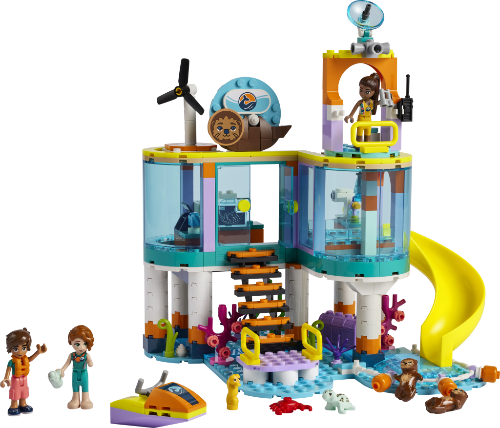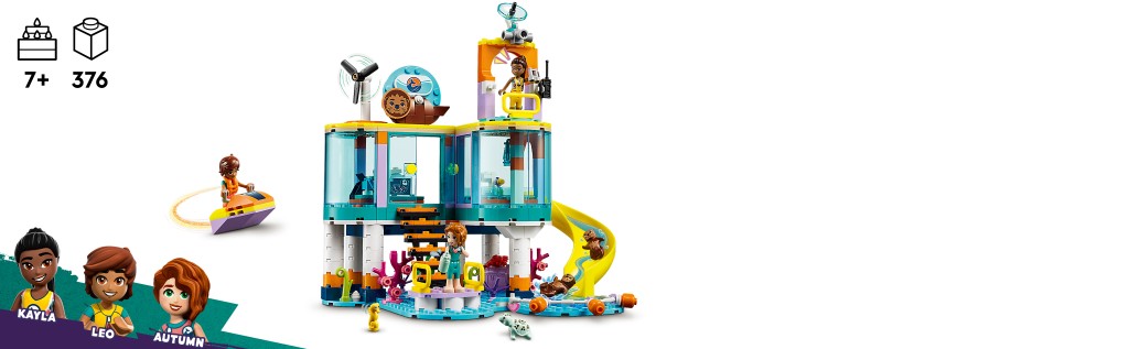- 3 minipanenky s doplňky – Stavebnice LEGO® Friends Námořní záchranářské centrum obsahuje postavu Autumn, Lea a Kaylu, 2 mořské vydry, mořského koníka a doplněk v podobě mořské želvy