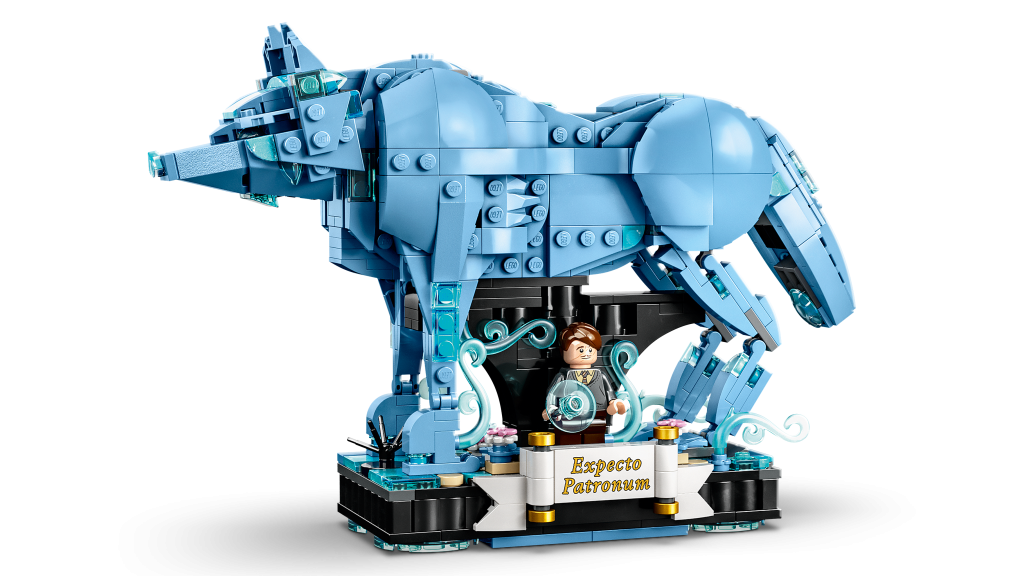 - Patron v podobě jelena – Součástí jsou polohovací nohy, průsvitné světle modré dílky pro přízračný efekt a zabudovaný podstavec na vystavení s ozdobnými prvky a místem pro minifigurku Harryho Pottera