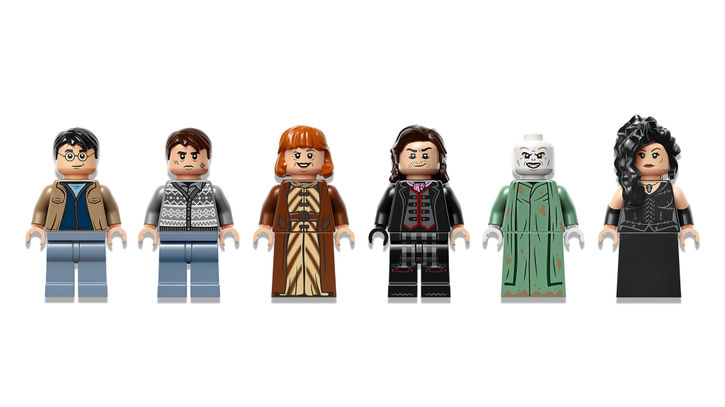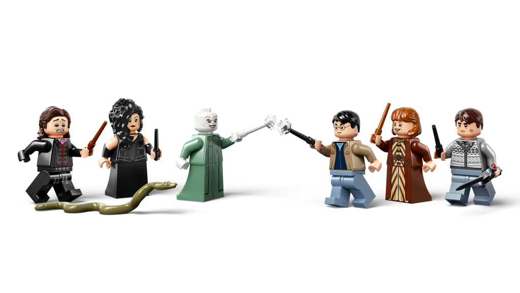 - 6 minifigurek LEGO® – Harry Potter™ a Voldemort™, každý s vlastní hůlkou a dílkem představujícím kouzlo, Neville Longbottom™ s Nebelvírovým mečem, Prašivec, Molly Weasleyová a Bellatrix Lestrangeová