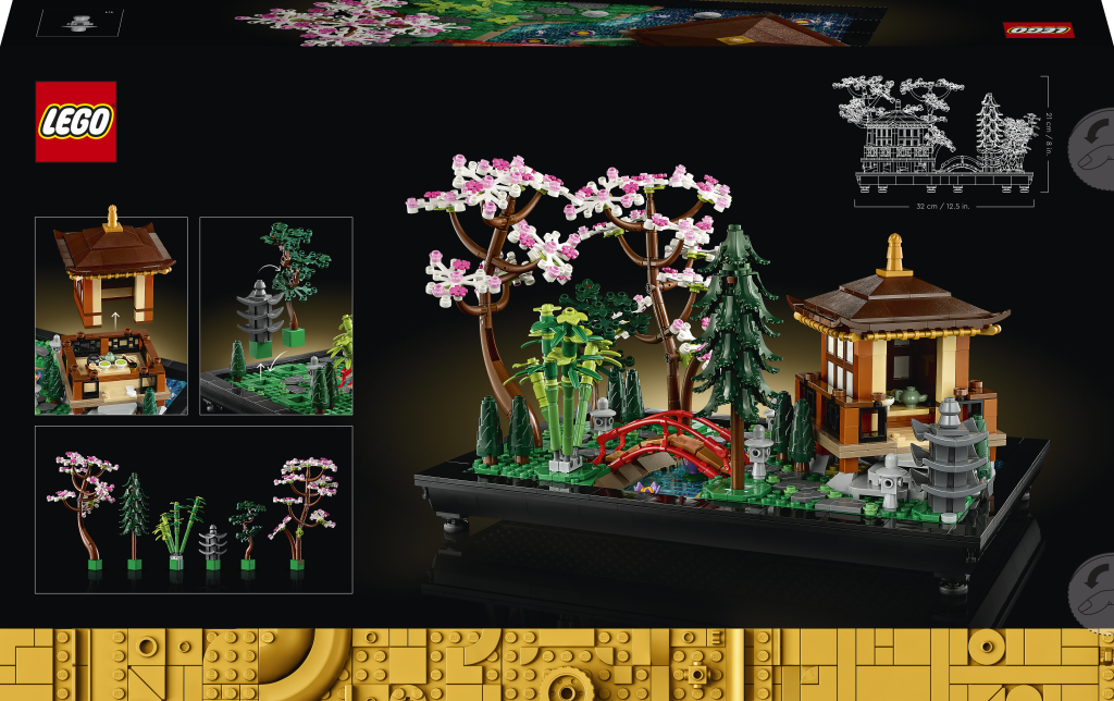 - Tento sestavitelný model je inspirován tradiční japonskou zahradou a obsahuje klenutý most, potůček, kapra koi, lotosové květy, stromy, kameny, kamenné lampy a pavilon s detailní místností pro čajové ceremonie