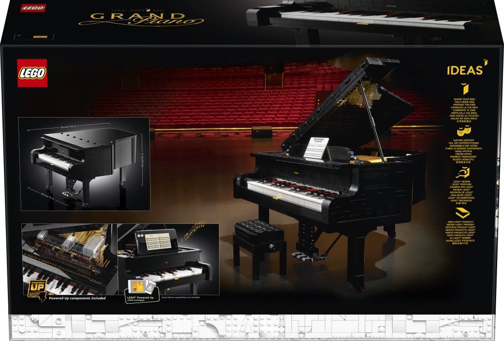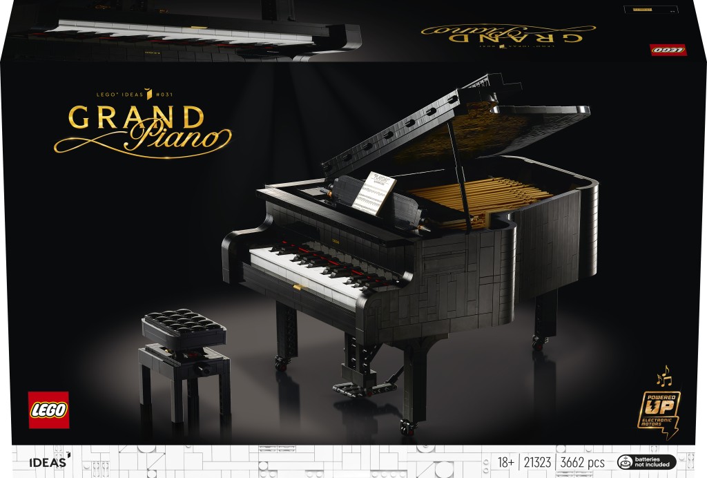 - Velké piano (21323) z řady LEGO® Ideas má odnímatelnou klaviaturu s 25 klávesami, autentické kladivo, pohyblivé tlumiče, pedál a motor. V kombinaci s aplikací LEGO Powered Up pak můžete ukázat svůj talent nebo si pustit automaticky přehrávanou melodii.