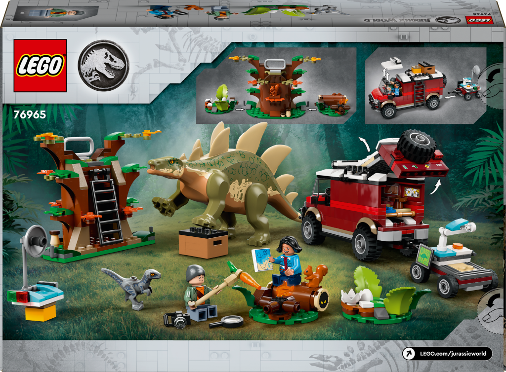 - Ve stavebnici Dinosauří mise: Objev stegosaura (76965) fanoušky od 6 let čekají kreativní dobrodružství s dinosaury a model poslouží jako krásný dárek plný hraní na postavy. Po sestavení této sady z řady LEGO® Jurassic World si děti mohou vymyslet nekonečné příběhy s odlévanou figurkou stegosaura s pohyblivýma nohama, malou figurkou velociraptora a minifigurkami Bena a Sammy. Součástí stavebnice je také strom s pozorovatelnou a 2 odnímatelnými částmi, terénní vozidlo s prostorem pro 2 minifigurky, odnímatelnou střechou, otevírací zadní částí, skládací postelí a hned několika úložnými prostory pro drobné dílky. Nechybí malý připojitelný přívěs s pohyblivou satelitní anténou, mikroskopem, obrazovkami a spoustou dalších detailů. Aplikace LEGO Builder malé fanoušky dinosaurů provede intuitivním stavitelským dobrodružstvím. Umožňuje jim přibližovat a otáčet modely ve 3D, ukládat stavebnice a sledovat postup. Stavebnice představuje zábavný dárek za skvělou cenu pro fanoušky řady Jurassic World a potěší také malé milovníky zvířat, dobrodružství a dinosaurů.