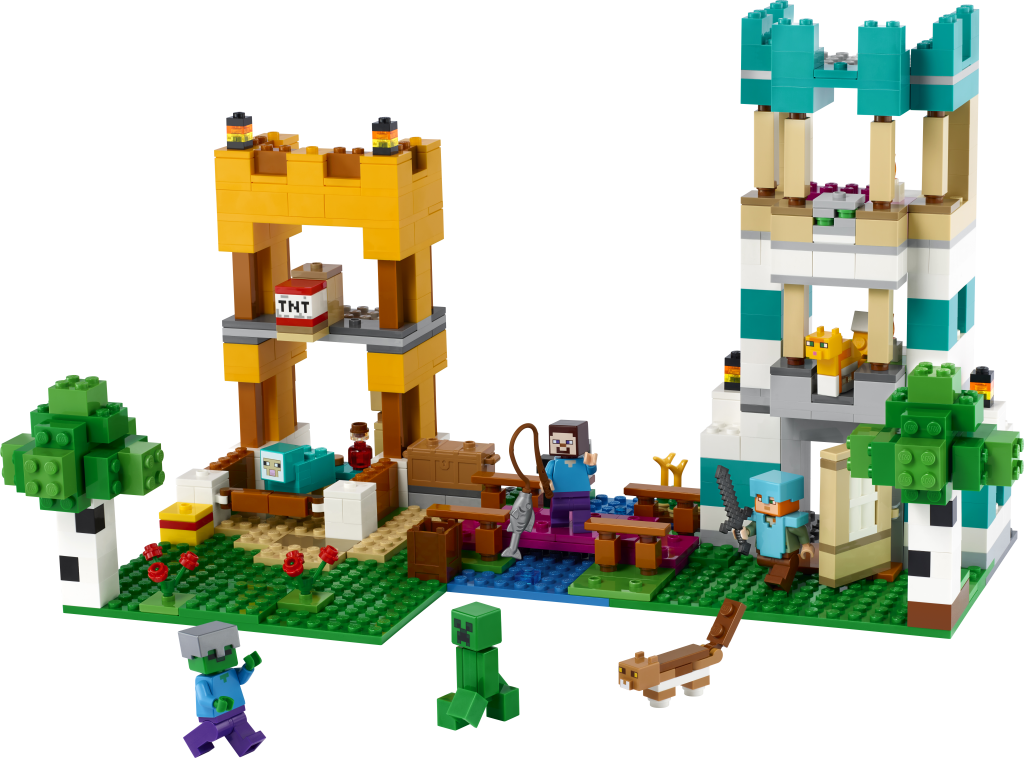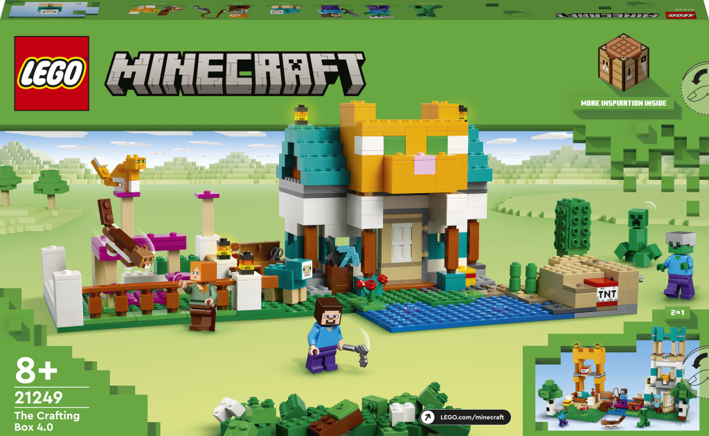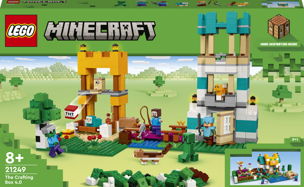 - 2 světy Minecraft® v 1 stavebnici – LEGO® Minecraft (21249) Kreativní box 4.0 inspiruje hráče 2 velkoprostorovými stavebnicemi a nekonečnou zábavou při volném stavění v 1 senzační sbírce kostek a dílků Minecraft