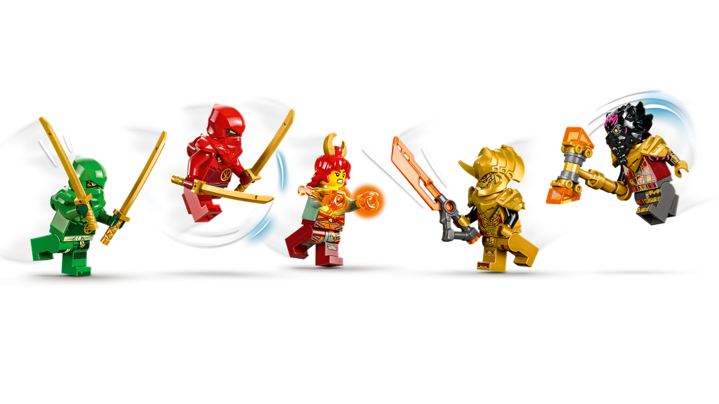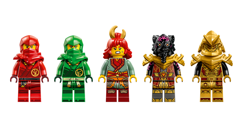 - 5 minifigurek – V této stavebnici z řady NINJAGO® najdete Kaie a Lloyda ozbrojeného 2 katanami, Wyldfyrea, císařského lovce s císařským mečem a lord Rase se zlatým kladivem