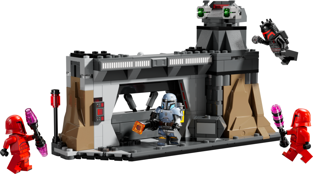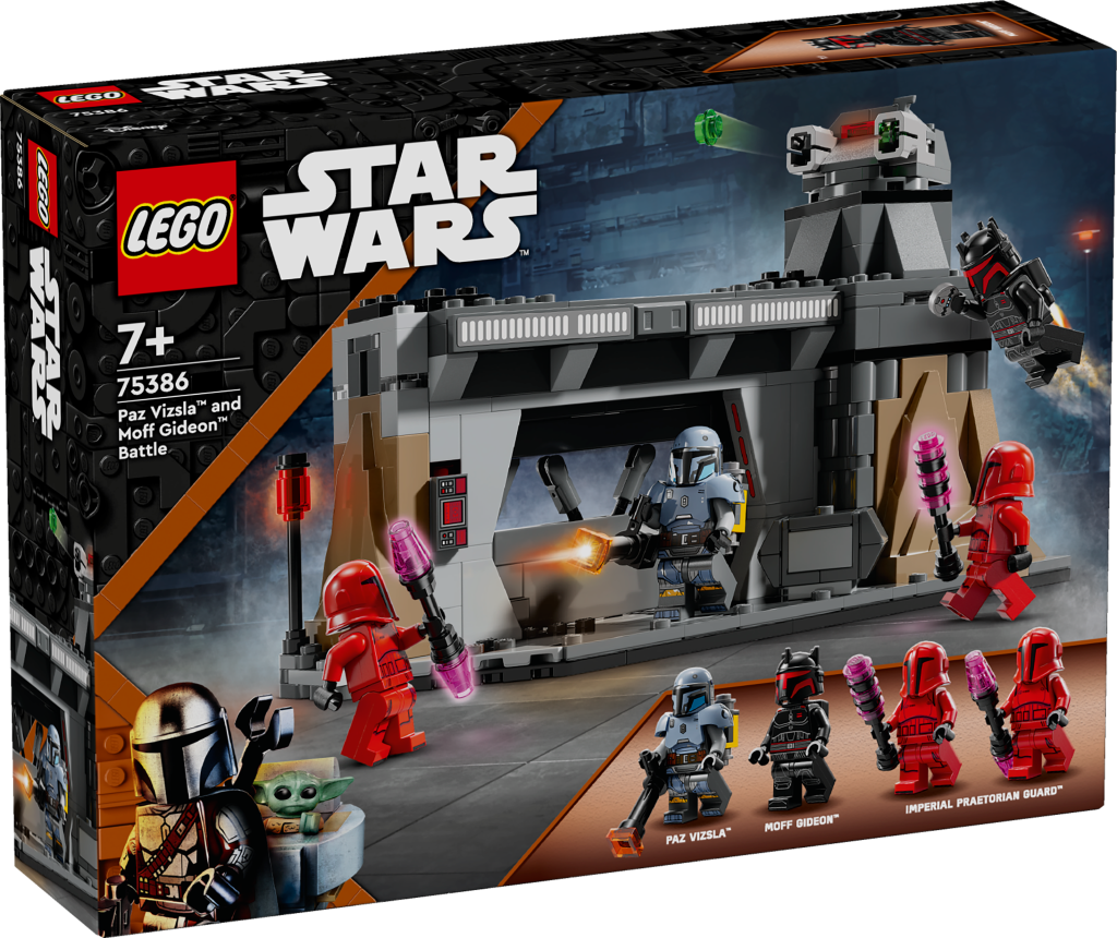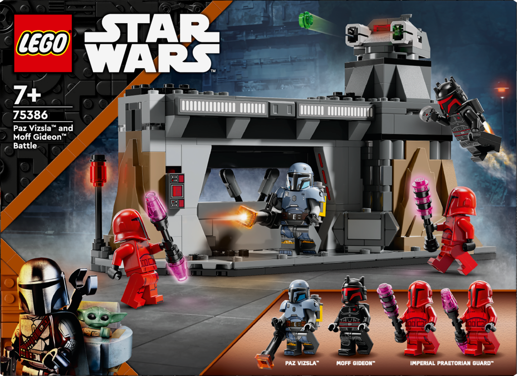 - Postavte si se stavebnicí LEGO® Star Wars™ (75386) Souboj Paze Vizsly a Moffa Gideona pro kluky, holky a fanoušky od 7 let napínavé scény z 3. řady seriálu Star Wars: The Mandalorian. Tato stavebnice z kostek LEGO představuje parádní fantasy dárek pro děti a součástí je mandaloriánská základna s obrněnými dveřmi se spouští, která se aktivuje při zabouchnutí, ovládací panely a otočnou vystřelovací věž. Nechybí ani 4 sběratelské minifigurky LEGO Star Wars: The Mandalorian, se kterými si můžete přehrávat souboj Paze Vizsly a Moffa Gideoa (v brnění Dark troopera) a imperiální pretoriánskou stráží, a navíc doplňky, jako je jetpack Moffa Gideona a úložný box s termálním detonátorem pro kreativní hraní. Dopřeje dětem ještě zábavnější stavitelské dobrodružství s aplikací LEGO Builder. V ní si lze přibližovat a otáčet digitální verze modelů ve 3D, ukládat stavebnice a sledovat postup. Mandaloriánskou základnu lze propojit se skálou/jeskyní ze stavebnice Bitevní balíček Mandalore (75373), (prodává se samostatně) pro ještě více herních možností.
