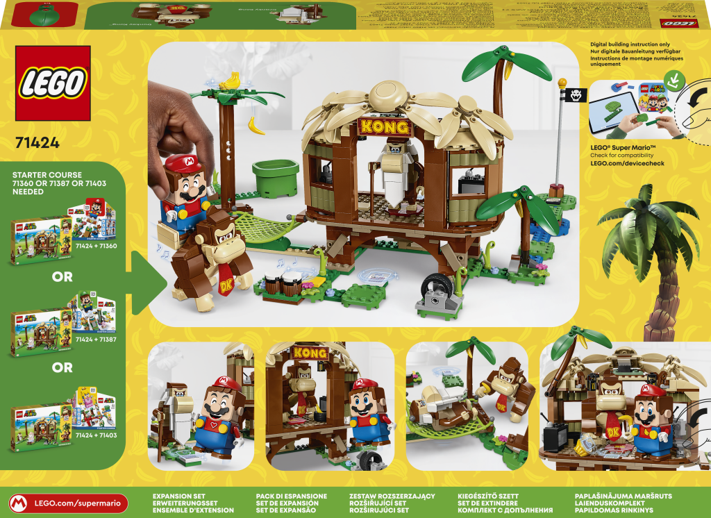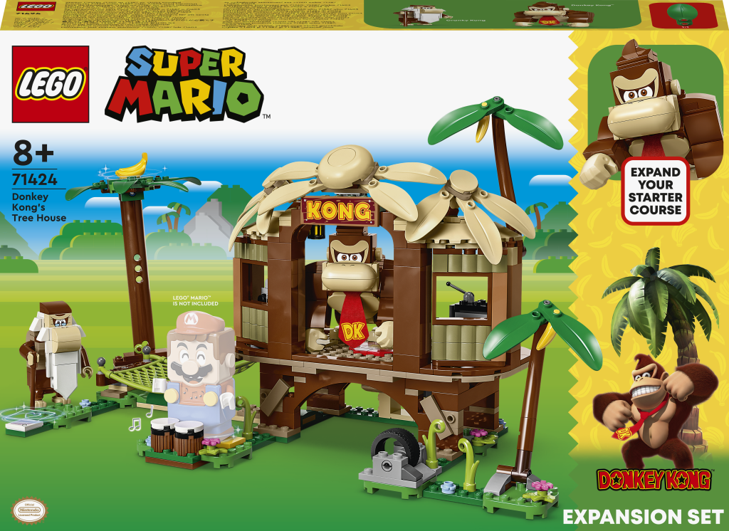 - Přidejte se k partě DK v Donkey Kongově domě na stromě (71424) – Děti se přidají v džungli k Donkey Kongovi a užijí si spoustu zábavy při rozdávání banánů a hraní na bubny konga s tímto pestrým rozšiřujícím setem LEGO® Super Mario™.